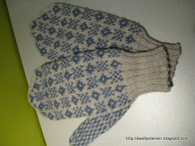 Poikaseni valitteli että lapaset alkavat käydä pieniksi joten pitihän äidin tehdä sitten uudet. Mallina sama kuvio kuin vuosia sitten tehdyssä pipossa joka on edelleen käytössä. Lankana tietenkin Novitan merinovillaista Woolia jota silloin hamstrasin.